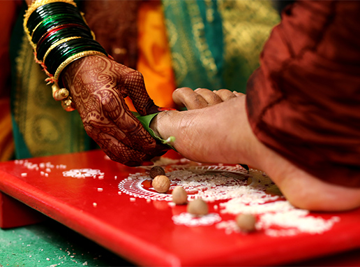 The saptapadi which literally means seven steps is another vital part of the wedding ceremony. Seven Betel nuts (Sopari) are placed before the bride and groom. The seven vows for married life are then recited by the couple while they touch seven betel nuts with their right toes.